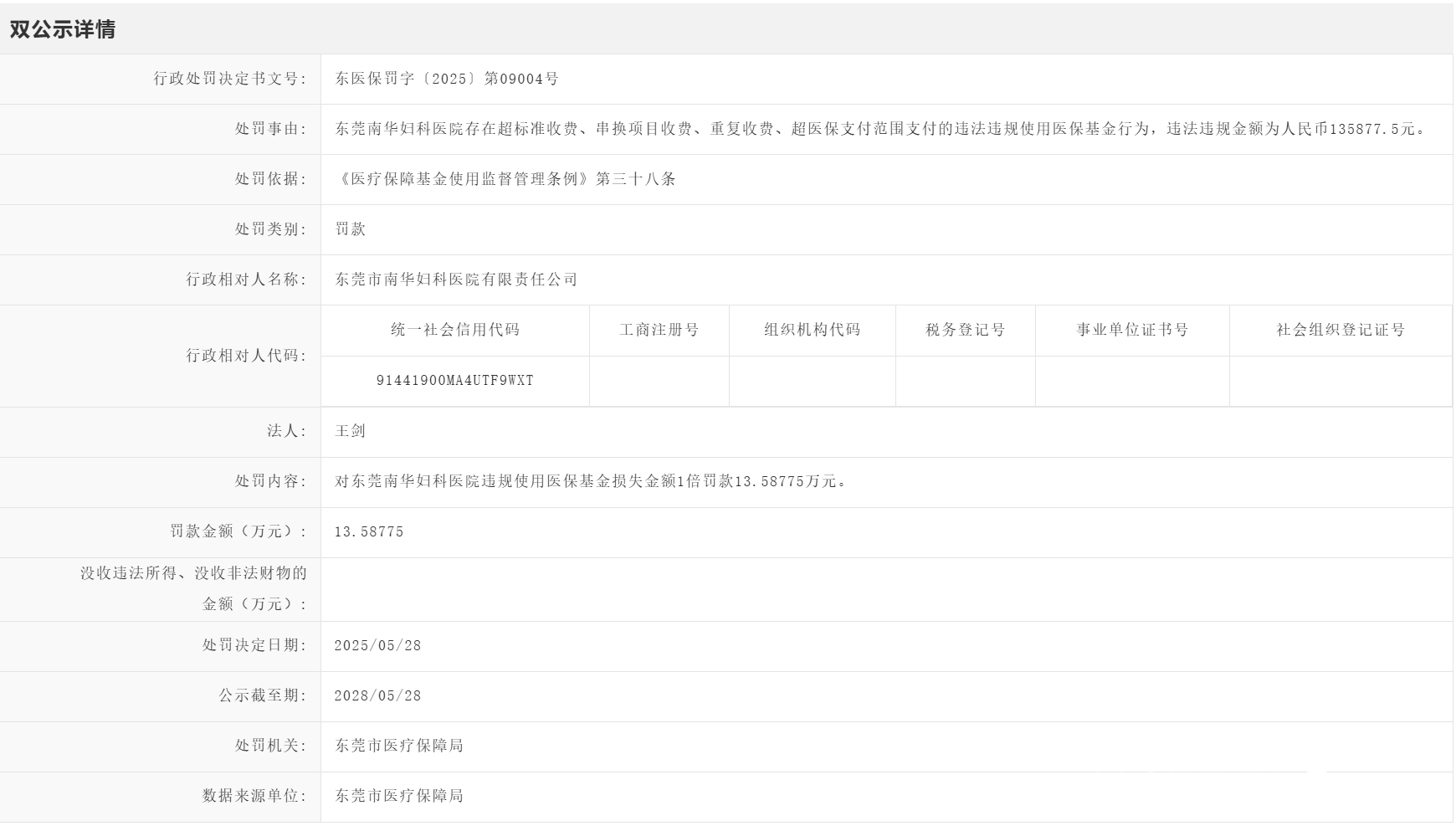 涉医保基金违规,东莞南华妇科医院被罚超13万元