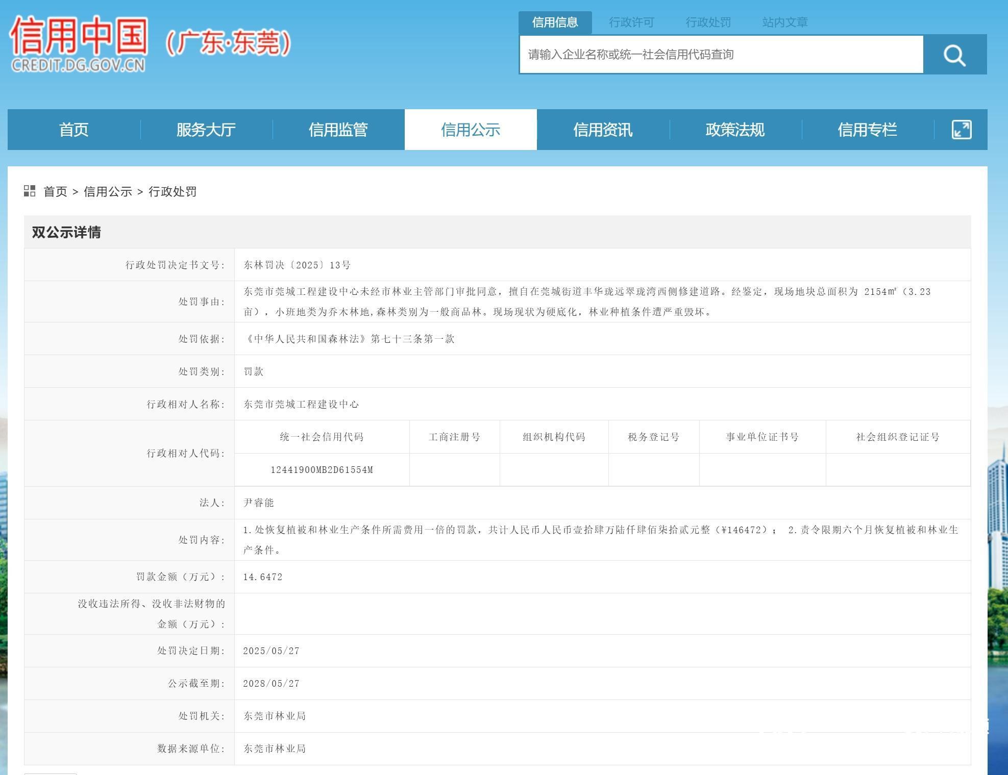 近日,东莞市林业局在信用中国(广东·东莞)通报称,东莞市莞城工程建设中心未经市林业主管部门审批同意,擅自在莞城街道丰华珑远翠珑湾西侧修建道路,被处14.6472万元罚款。